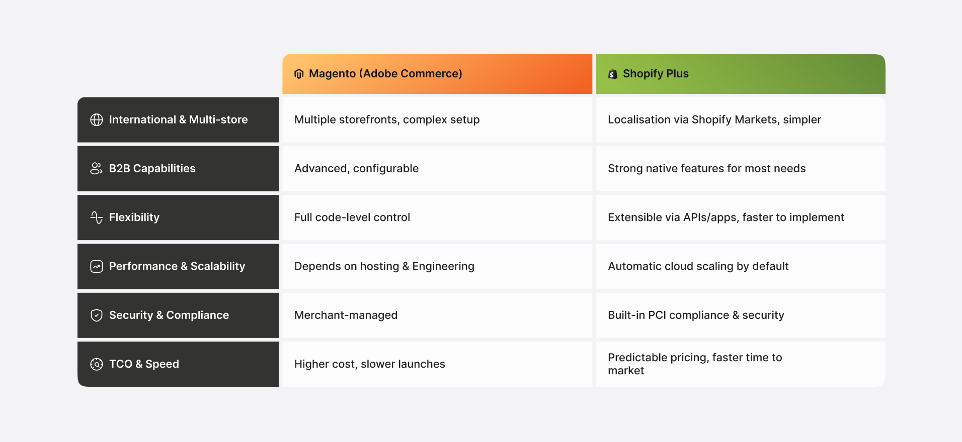 For large businesses, scalability is no longer just about handling traffic spikes, it’s about scaling teams, operations, and international growth without multiplying technical overhead. While Magento can scale with the right infrastructure and engineering investment, Shopify Plus offers scalability as a built-in service. Its cloud-native architecture removes the need for capacity planning, infrastructure tuning, or emergency fixes during peak periods, which is why many enterprise brands now view Shopify Plus as the more scalable platform in practice.